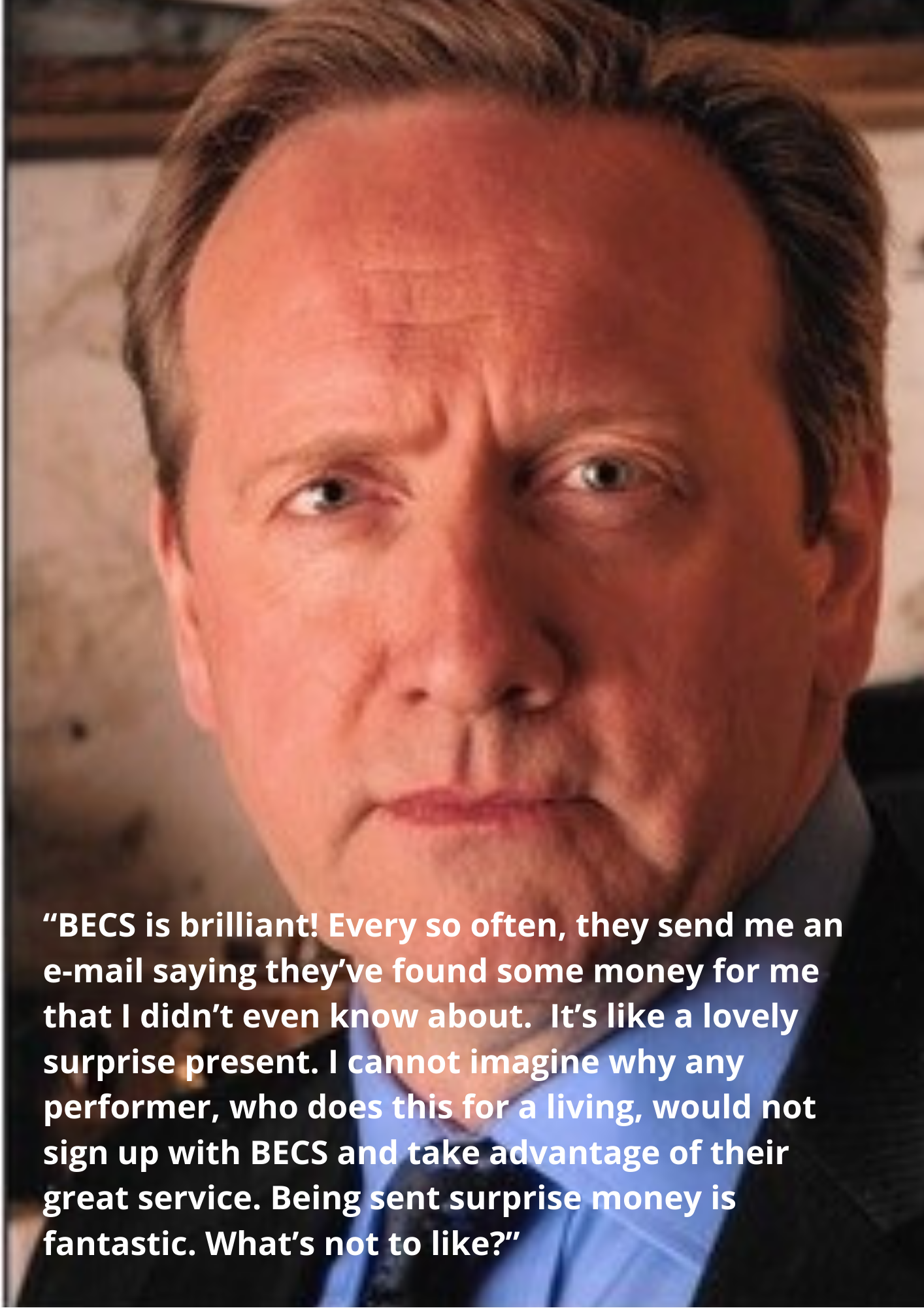 “I am very happy to be an ambassador for BECS. Not only are they a regulated, not-for-profit organisation doing great work to protect and improve performers rights in the UK and abroad, but they also send you money that can only be collected by a Collecting Society for members. It costs you nothing to join and THEY WILL SEND YOU MONEY! Join.”